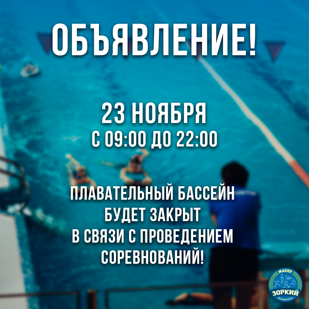 Уважаемые посетители плавательного бассейна МАСОУ "Зоркий! 23 ноября 2025 года (воскресенье) с 09:00 до 22:00 плавательный бассейн будет закрыт в связи с проведением соревнований.