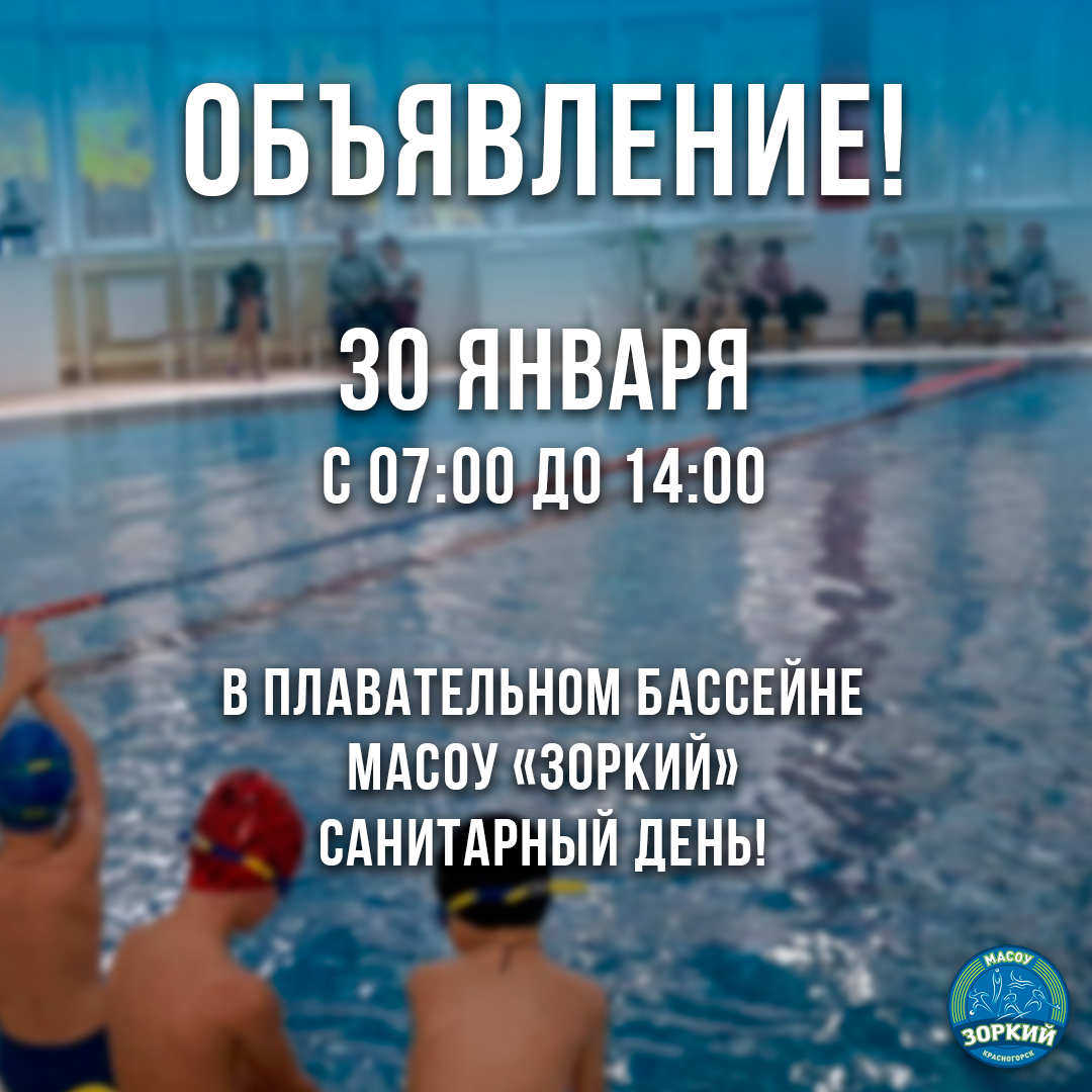 30 января 2026 года (пятница) с 07:00 до 14:00 в плавательном бассейне МАСОУ "Зоркий" будет проходить плановое санитарное обслуживание.