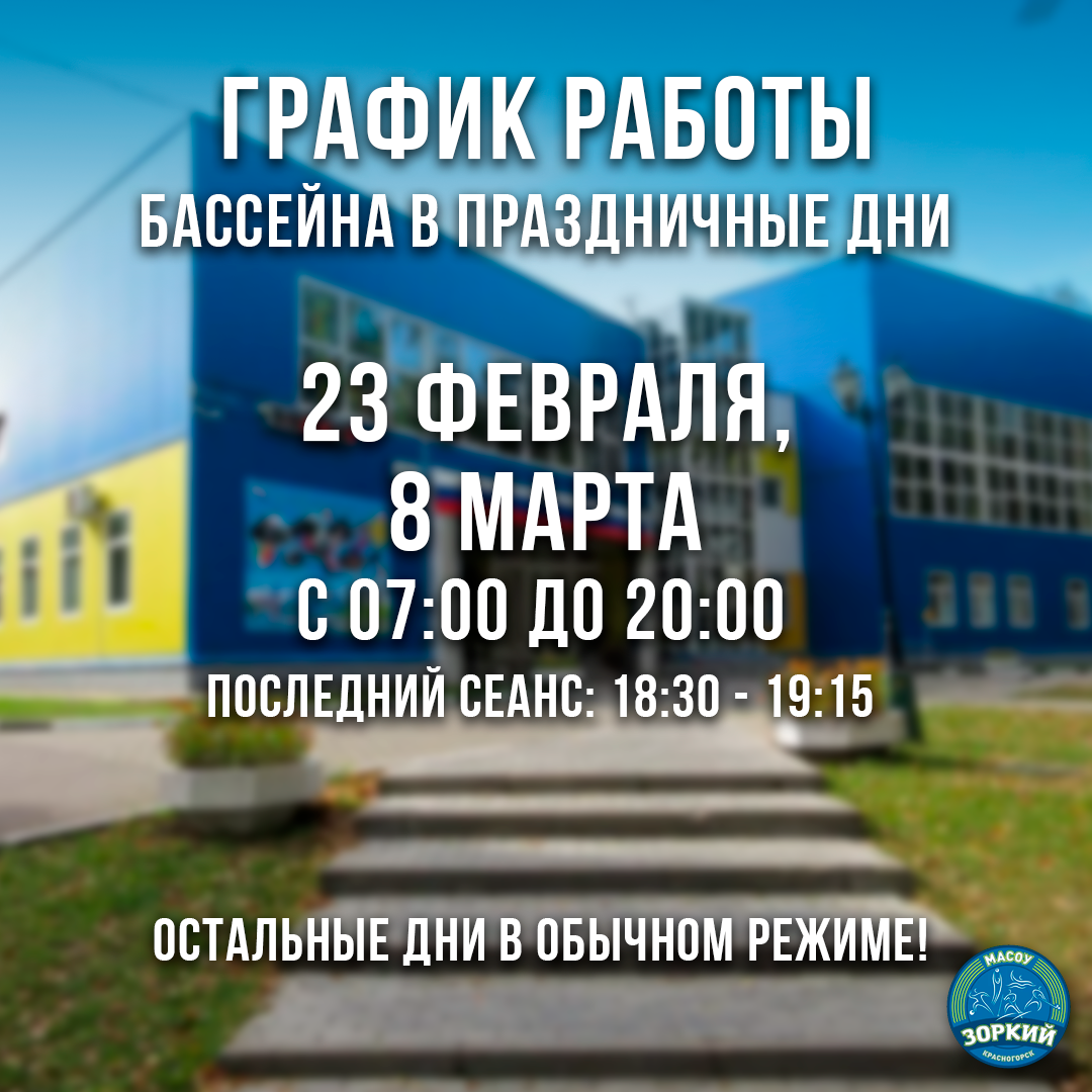 Уважаемые посетители плавательного бассейна МАСОУ "Зоркий"! 23 февраля и 8 марта 2025 года бассейн работает с 07:00 до 20:00, при этом последний сеанс с 18:30 до 19:15. Остальные дни бассейн работает в обычном режиме.
