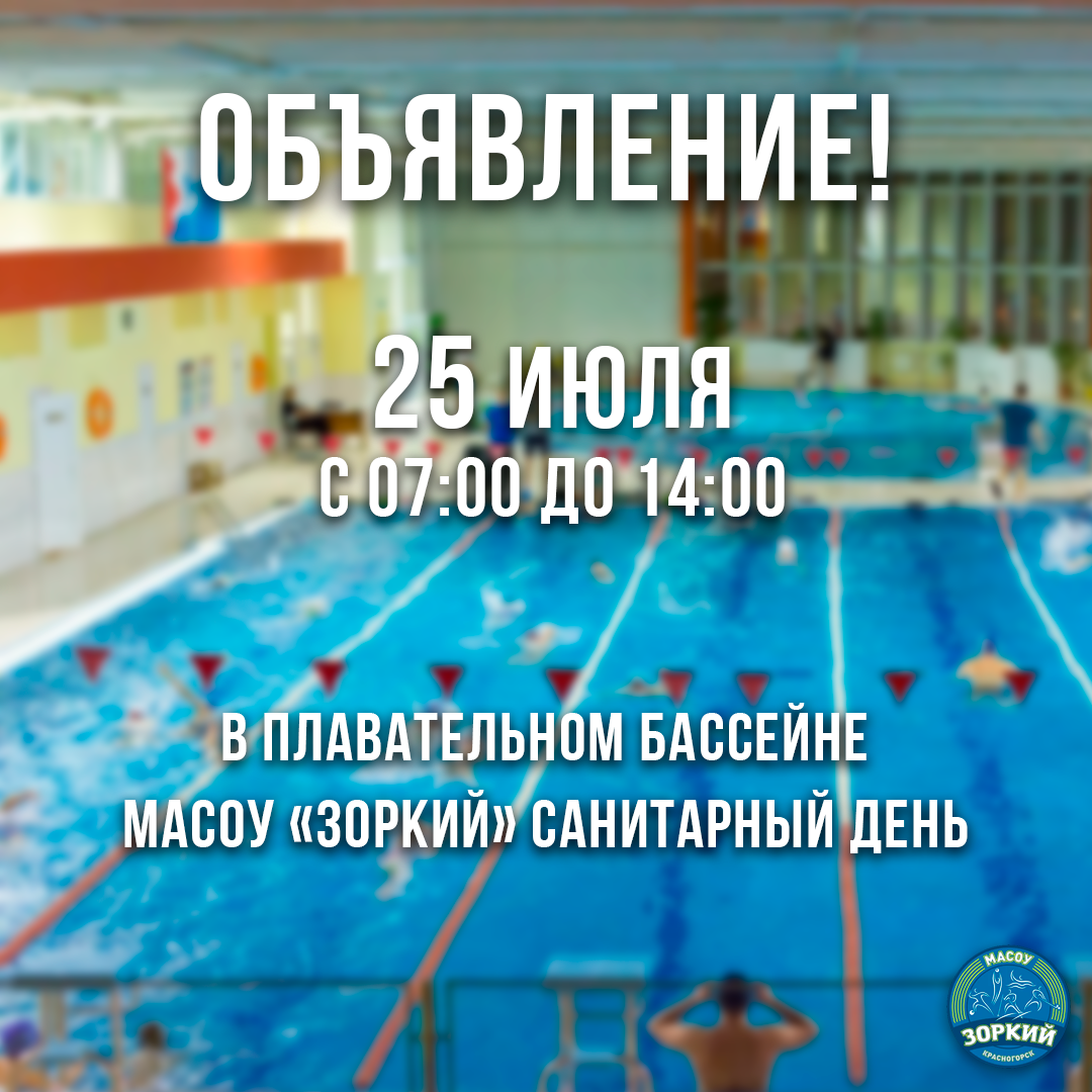 25 июля (пятница) с 07:00 до 14:00 в плавательном бассейне МАСОУ "Зоркий" будет проходить плановое санитарное обслуживание.