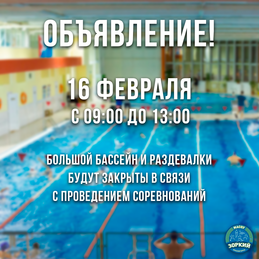 Уважаемые посетители! 16 февраля 2025 года с 09:00 до 13:00 большой бассейн и раздевалки будут закрыты в связи с проведением соревнований. Приносим свои извинения за временные неудобства.