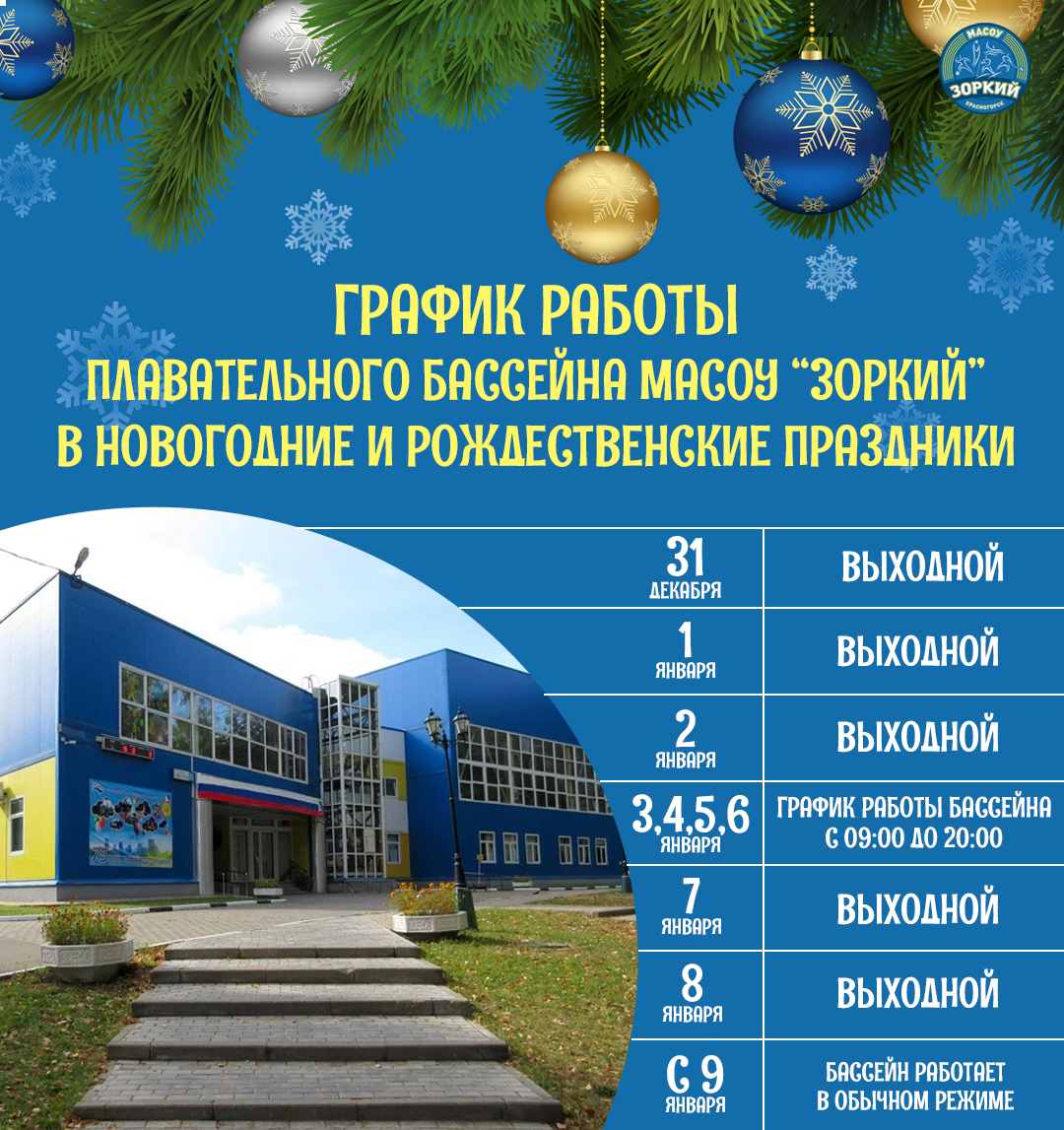 График работы плавательного бассейна МАСОУ "Зоркий" в новогодние и рождественские праздники!