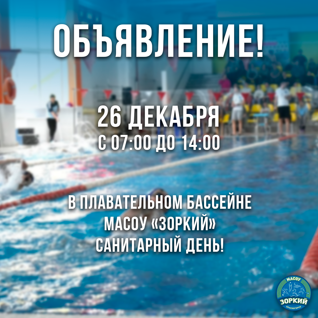 26 декабря 2025 года (пятница) с 07:00 до 14:00 в плавательном бассейне МАСОУ "Зоркий" будет проходить плановое санитарное обслуживание.