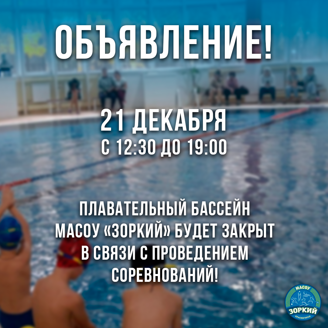 Уважаемые посетители плавательного бассейна МАСОУ "Зоркий! 21 декабря 2025 года (воскресенье) с 12:30 до 19:00 плавательный бассейн будет закрыт в связи с проведением соревнований.