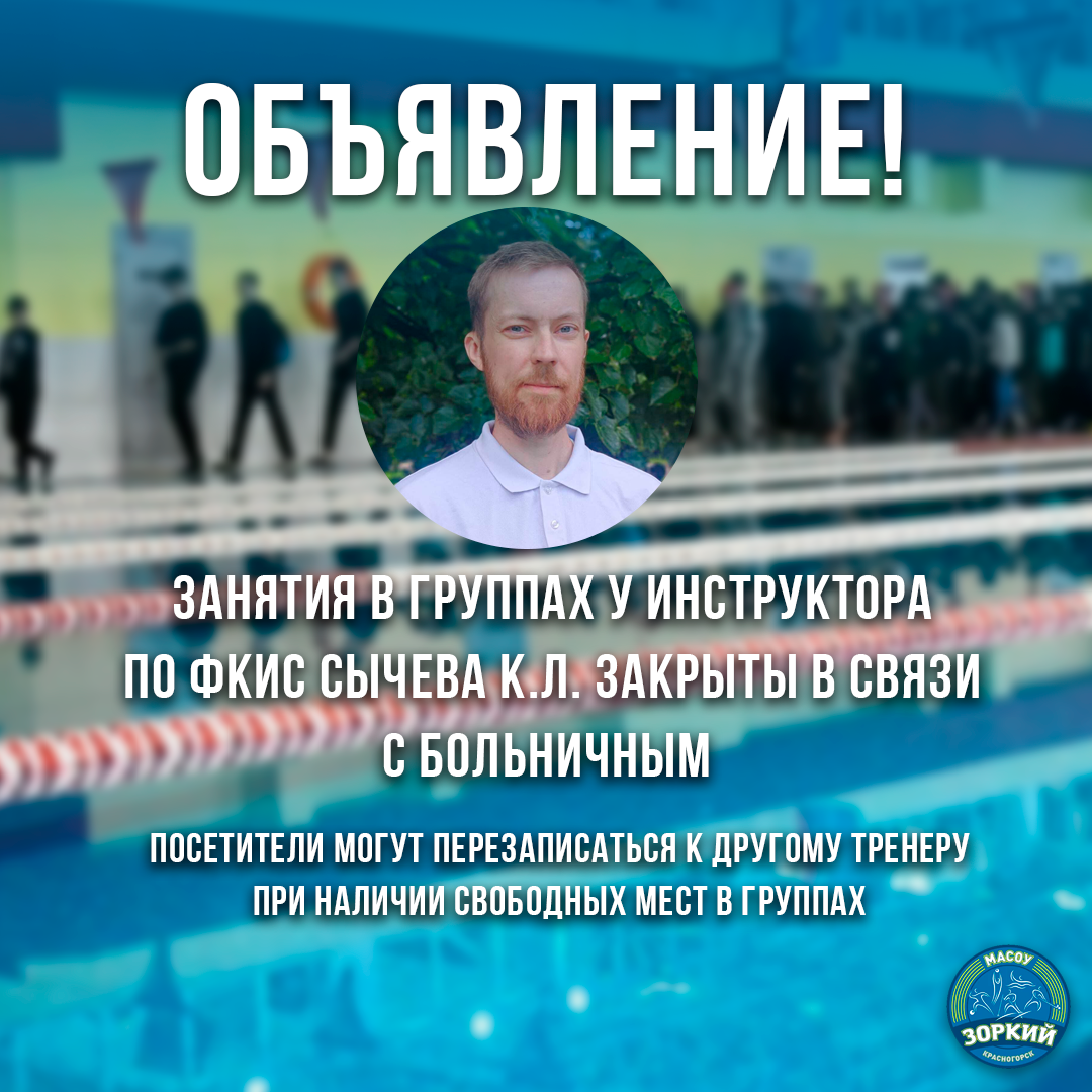 Уважаемые посетители плавательного бассейна МАСОУ "Зоркий! Занятия в группах у инструктора по ФКиС Сычева К.Л. закрыты в связи с больничным. Посетители могут перезаписаться к другому тренеру, при наличии свободных мест в группах.
