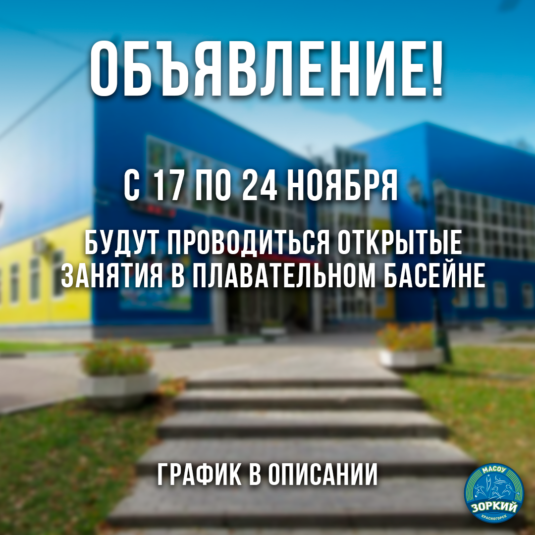 Уважаемые жители городского округа Красногорск! В плавательном бассейне МАСОУ "Зоркий" с 17 по 24 ноября 2025 года будут проводиться открытые занятия с инструкторами! Ждем вас!