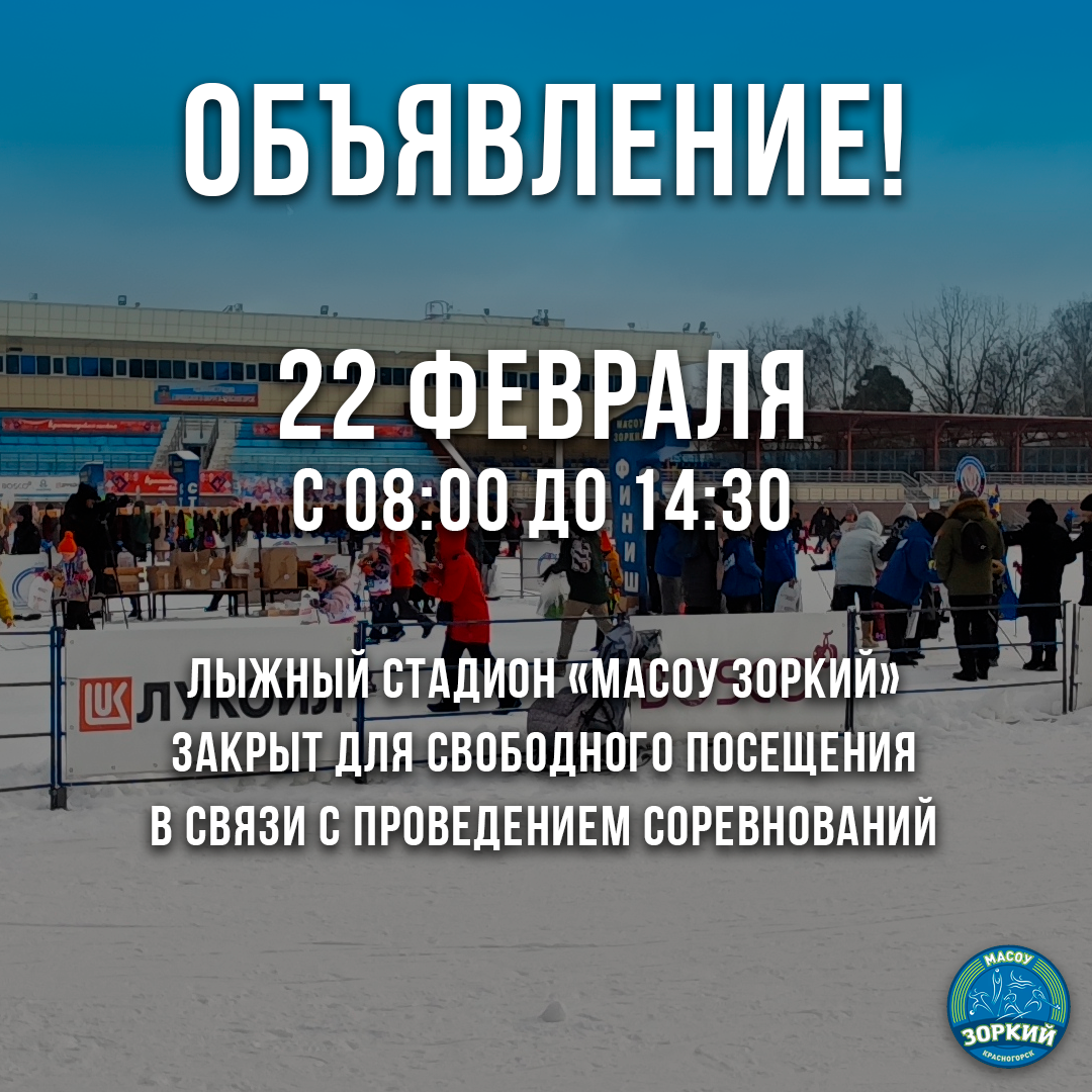 Уважаемые жители городского округа Красногорск! 22 февраля 2025 года до с 08:00 до 14:30 лыжный стадион МАСОУ "Зоркий" будет закрыт для свободного посещения в связи с проведением соревнований. Приносим свои извинения.