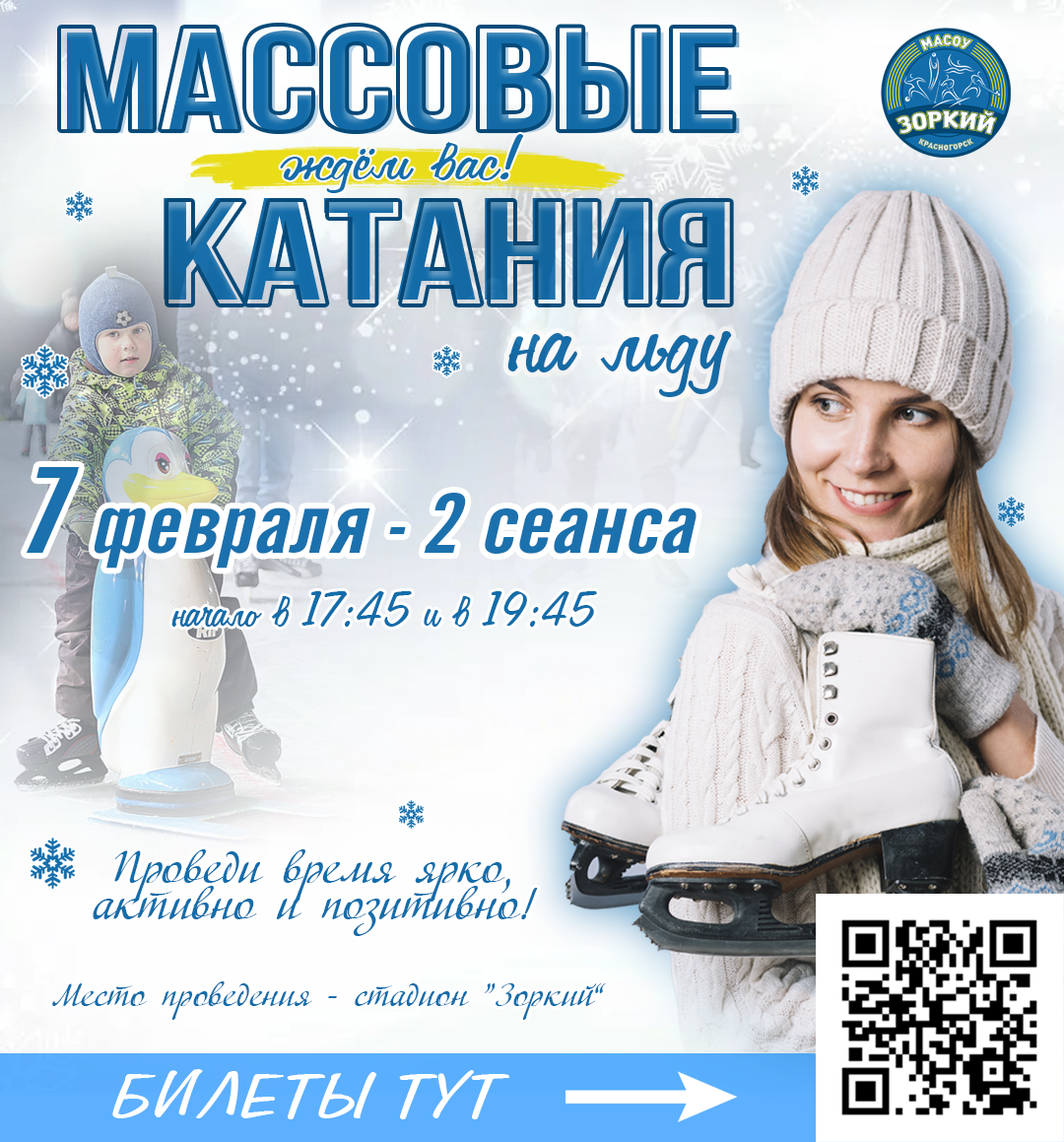 7 февраля на льду стадиона "Зоркий" пройдут массовые катания на коньках. Всех приглашаем провести время ярко, активно и позитивно. Заряд бодрости и хорошего настроения вам обеспечен!