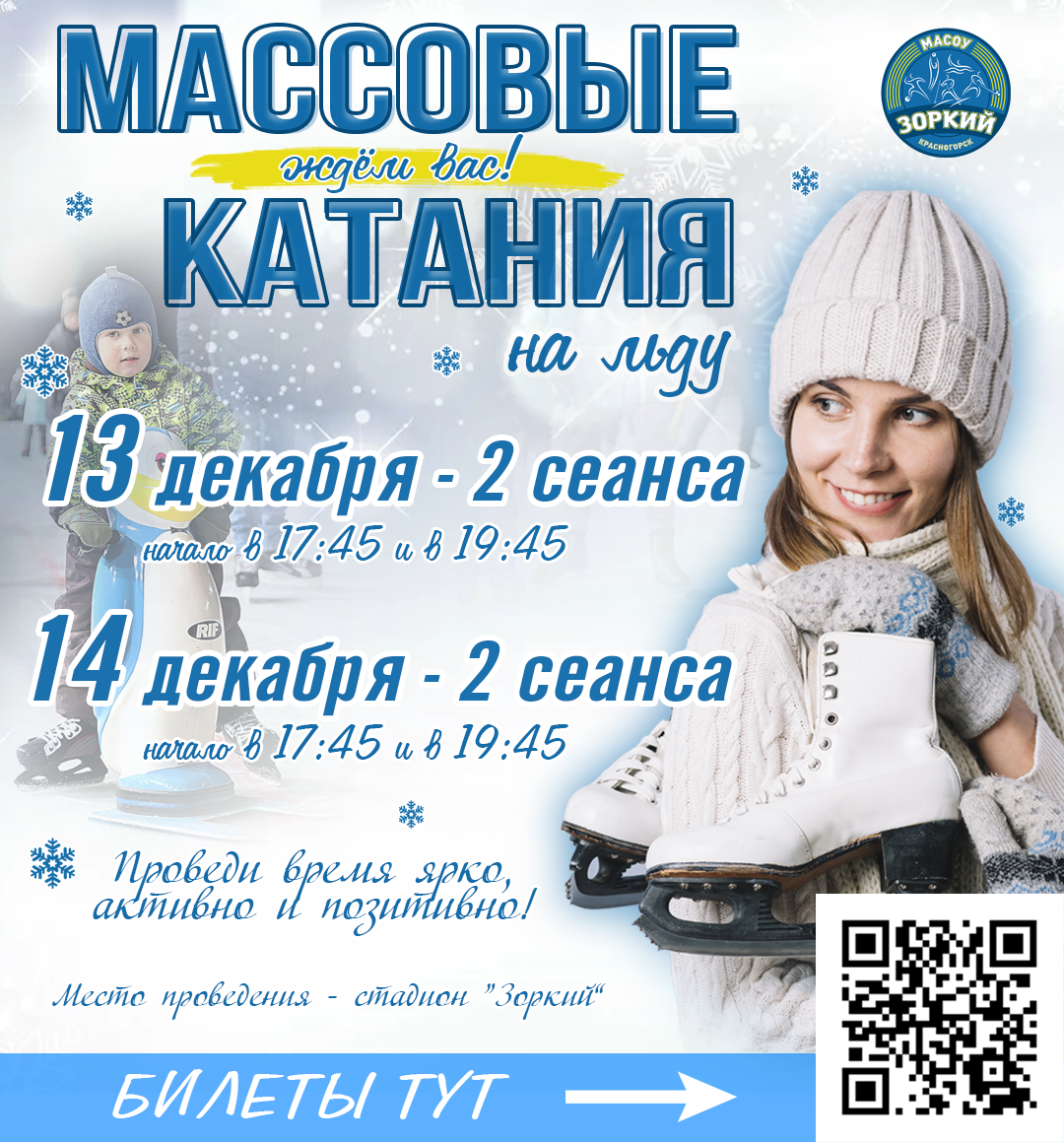 13 и 14 декабря на льду стадиона "Зоркий" пройдут массовые катания на коньках. Всех приглашаем провести время ярко, активно и позитивно. Заряд бодрости и хорошего настроения вам обеспечен!