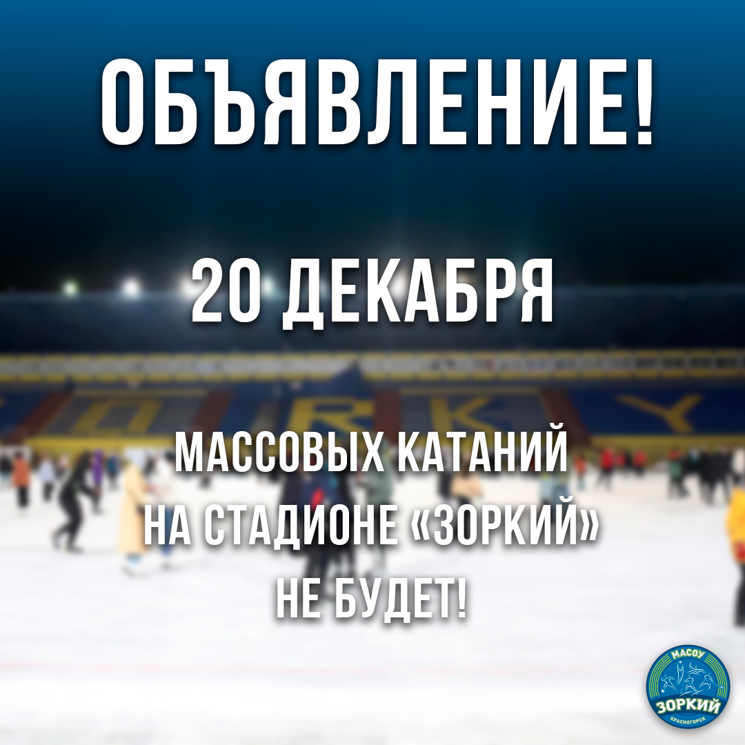 Уважаемые жители городского округа Красногорск! 20 декабря 2024 года (пятница) массовых катаний на стадионе "Зоркий" не будет!