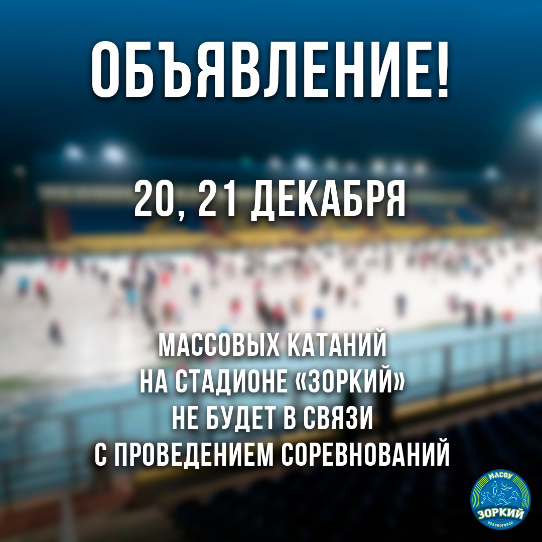 Уважаемые жители городского округа Красногорск! В ближайшие выходные, 20 и 21 декабря, массовых катаний на стадионе "Зоркий" не будет в связи с проведением соревнований.