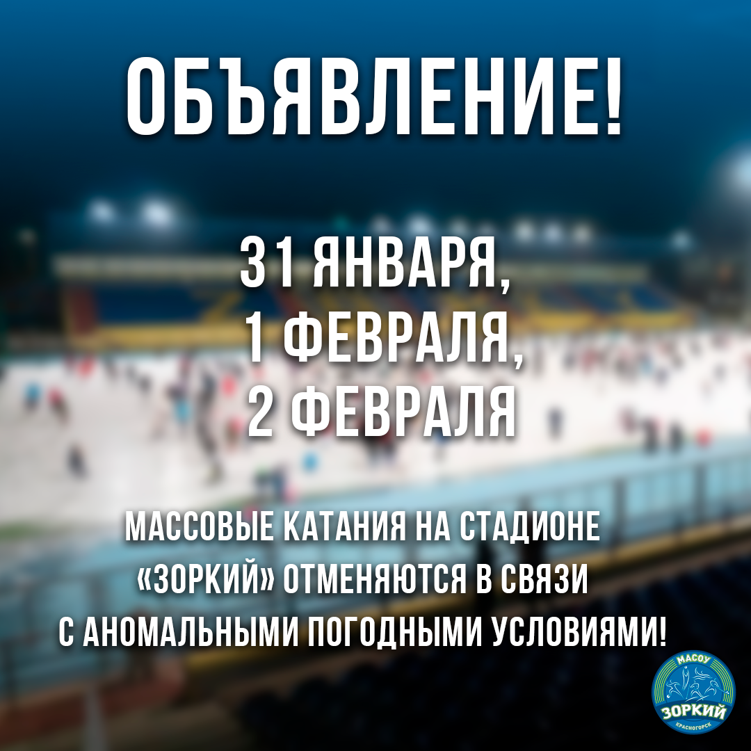 Уважаемые жители городского округа Красногорск! Сообщаем, что 31 января, 1 и 2 февраля 2025 года массовые катания на стадионе "Зоркий" отменяются в связи с аномальными погодными условиями!
